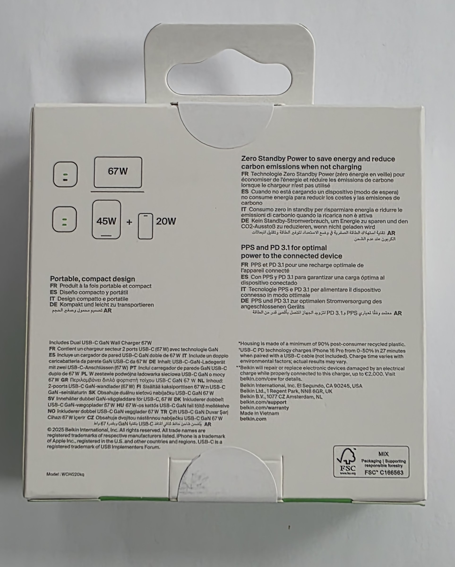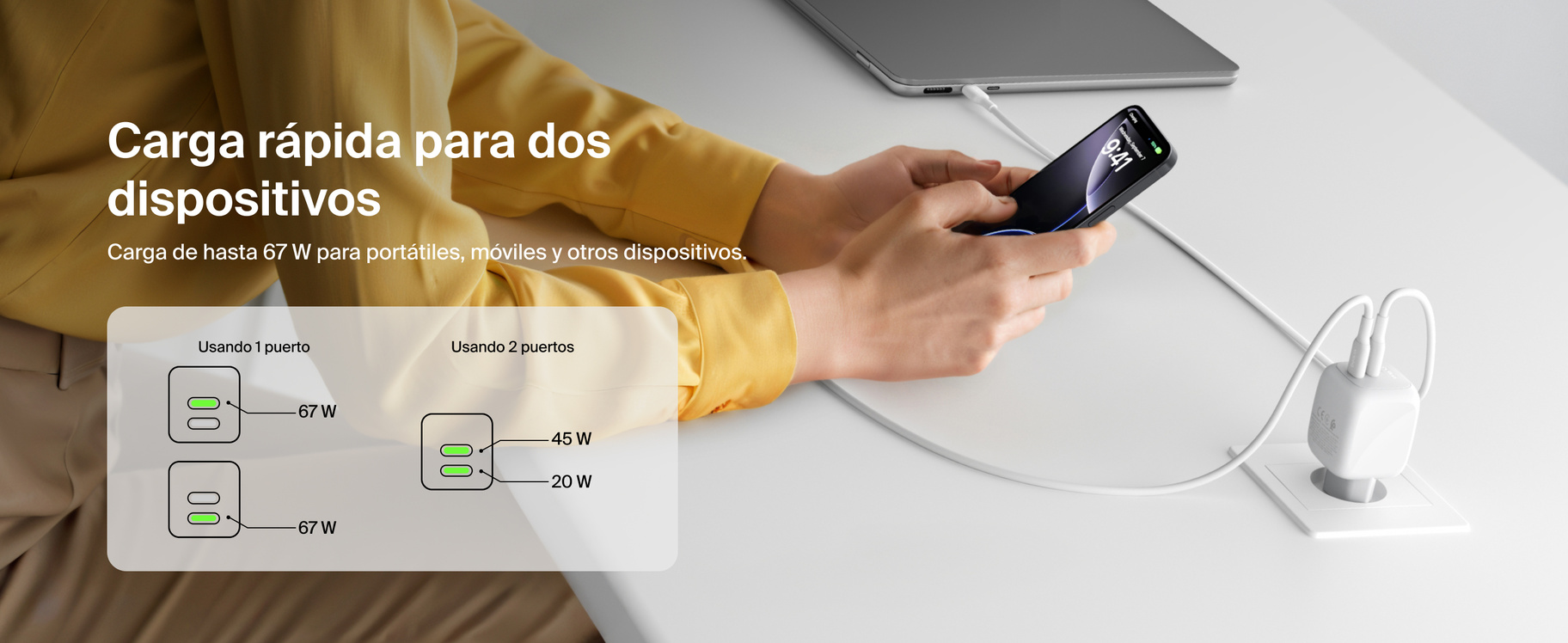 Pequeño, pero matón este cargador de pared incluye la potente tecnología de carga GaN de 67 W que permite usar uno de los puertos para cargar la mayoría de portátiles o los dos para cargar dos móviles. Para aquellos profesionales que se desplazan con frecuencia por trabajo y dependen de sus móviles, portátiles, tabletas, auriculares y Apple Watch este cargador de pared ligero y portátil se convertirá en una herramienta esencial. Provisto de dos puertos USB-C para dar respuesta a todas tus necesidades de carga.